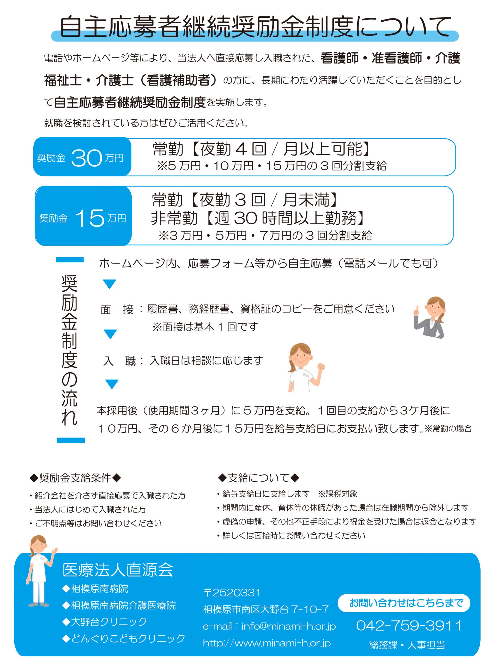 ※直接ご応募頂いた方は「自主応募者継続奨励金制度」の対象となり、入職祝金として30万~15万円が支給されます。